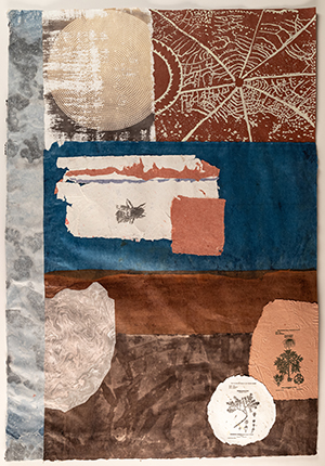 My devotion to textiles involves a systematic process of building a vocabulary through materials investigation. This science and art include cooking, beating, hand coloring, sheet forming, pressing, and drying to transform fiber into strong beautiful paper. I often use batik-like resist with surface treatments like natural dyes: walnut, persimmon, indigo, and earthy pigments: red iron oxide, carbon black, and ochre. I am intensely driven towards these processes, but it is ideas, emotion and meaning that transform the materials into artwork.